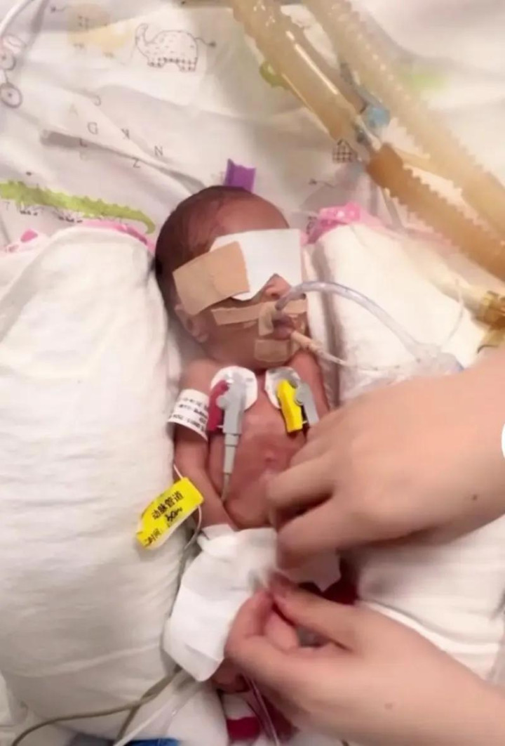 基于种种原因,他们后来找到了一个私立的医院,他们塞钱给手术的医生,最终让他们的孩子在34+2天剖腹产出生了,出来的孩子只有4斤2两,瘦得像一只猫咪一样,身上还毛茸茸的,皮肤皱巴巴的,眼睛都睁不开,连呼吸都是非常的虚弱。